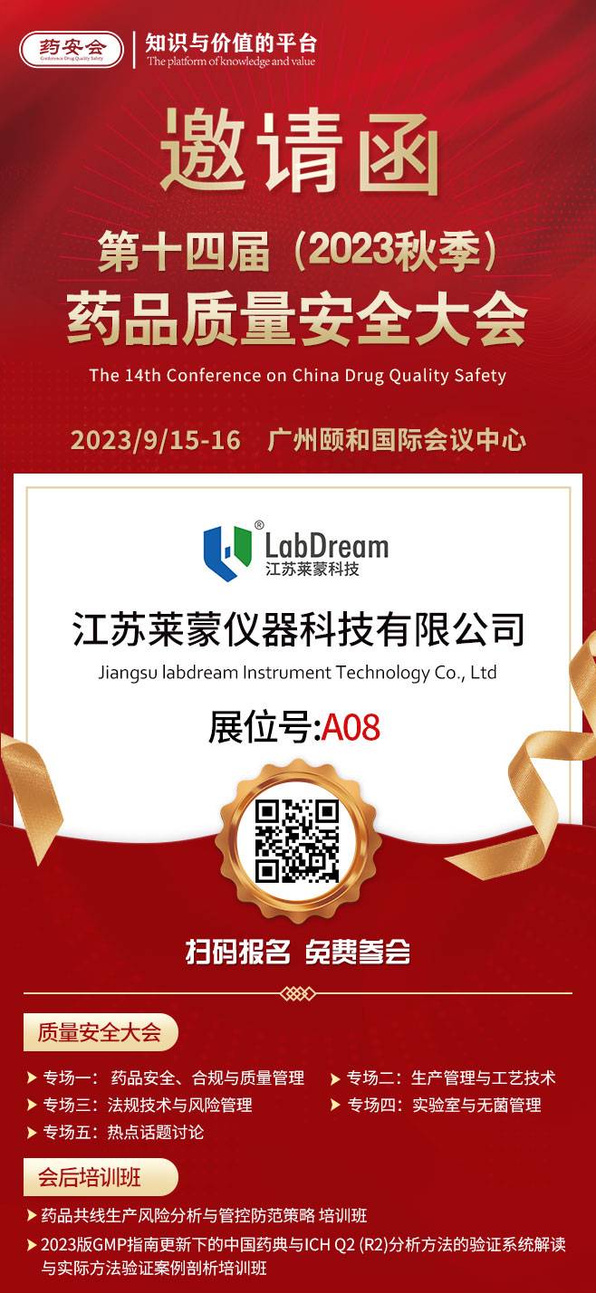 江蘇萊蒙誠邀您參加 第十四屆 (2023秋季) 藥品質量安全大會 LABDREAM 聽行業大咖探讨藥品安全,合規管理,生産及工藝技術,實驗室及無菌管理,法規更新,風險管理等熱門幹貨話題! 萊蒙科技(A08)将首次攜最新流動相自動化産品樣機亮相展會,屆時更有豐富禮品贈送,歡迎各位老師莅臨參觀!